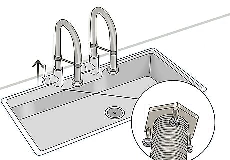 Drill a 1.25 in (3.2 cm) hole next to your regular faucet. The filtration system will have its own faucet that the purified water will come out of. Choose a location on your sink about 4–5 inches (10–13 cm) away from your faucet and insert a 1.25 inches (3.2 cm) drill bit into the end of your power drill. Place the end of the bit against your sink, apply pressure, and drill through it to create an opening for your new faucet. If your sink is stainless steel, use a carbide-tipped drill bit and lubricate it with cutting oil to keep it from overheating.Note: If your sink already has a pre-existing hole that’s covered by a rubber stopper or if you have a soap dispenser or sprayer, use that for your filter system’s faucet instead.