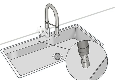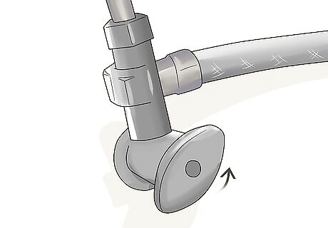 Shut off the cold water supply to your sink by turning the valve. Locate the cold water supply valve beneath your sink. It will look like a round knob or a lever labeled either “Cold” or will be the color blue. Turn the knob or pull the lever to move it into the off position. Test to make sure that the water has been turned off by turning on the sink’s tap. If you can’t find the shutoff valve, look on the lowest level of your home where your water lines run. Generally, cold water lines are located on the left and hot water lines are located on the right beneath your sink.