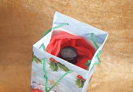 Get some tissue paper and put a little on the bottom, put the gift in, and put the rest on top and fluff it out! Then, after that, put a sticker tag on the bag and address it! There you go! The bagged method!
