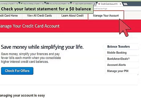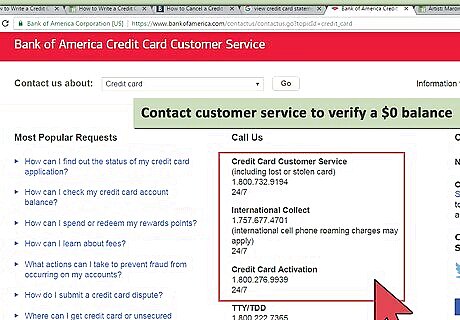 Contact customer service to verify a $0 balance. When you believe that your account is fully resolved, call the credit card company’s customer service number. Ask to verify the amount due on your card. If the representative verifies that there is no balance, you can then proceed to cancel the account. You should be able to find the customer service number for your account either on the back of your credit card or on the monthly statement.