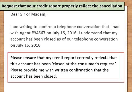 Confirm the cancellation. The company may need 30 days or more to finalize the cancellation and for notice to reach the credit reporting agencies. After waiting for about a month, you should check to make sure the cancellation is on the report, with the note that the account was closed at your request.