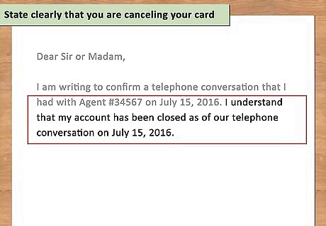 State clearly that you are canceling your card. You do not need to apologize or give any explanation for choosing to cancel your credit card account. You are entirely within your right to do so, as long as you no longer owe any money. A simple sentence should suffice: “I understand that my account has been closed as of our telephone conversation on July 15, 2016.”