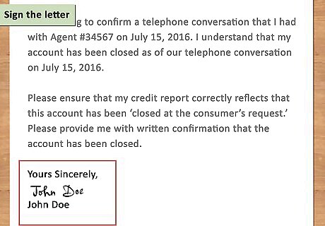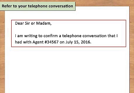 Refer to your telephone conversation. In your letter, make reference to the recent telephone conversation that you had regarding your account. This will help put your letter into context and explain why you are writing. For example, your letter may begin, “Dear Sir or Madam, I am writing to confirm a telephone conversation that I had with Agent #34567 on July 15, 2016.”