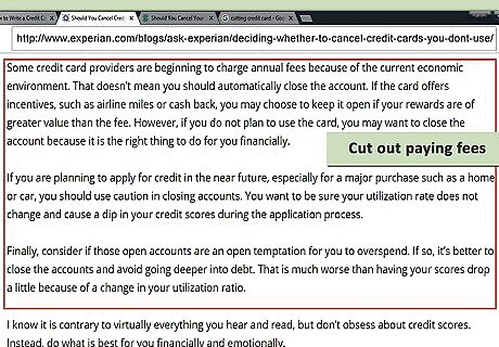 Cut out paying fees. Some credit cards require the payment of an annual fee in order to use -- or even just to have -- the card. If you have cards that require an annual fee, you may be better off by cancelling those accounts and focusing on the cards that are cheaper to use. On the other hand, some cards that charge a fee may also give you incentives for using the card. These incentives could be cash-back awards, free airline miles, gasoline discounts, or some other valuable awards. If the incentives outweigh the fee, you might be ahead by keeping the card and paying the fee.