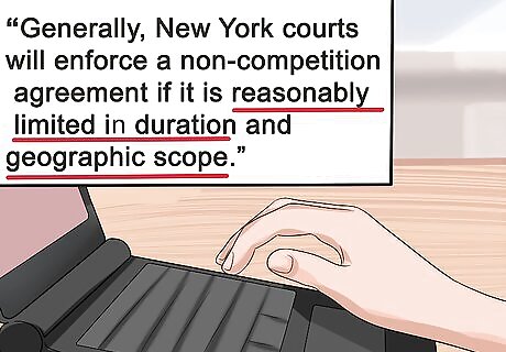 Outline the controlling area of law. Begin an outline in a blank word processing document. Outline the law according to its elements. For example, if you are outlining the law on whether non-compete provisions in employment contracts are legal, then you should state the general rule at the top of the page: “Generally, New York courts will enforce a non-competition agreement if it is reasonably limited in duration and geographic scope.” Then break the rule into elements. The above rule has two elements: (1) reasonable duration and (2) reasonable geographic scope.