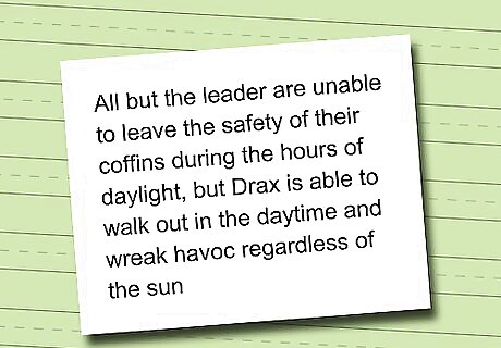 Decide on the vampire's abilities. Can he change shape? Can he fly? It is up to you on the abilities of your vampire(s). Dracula and other historical vampires can float, go through locked doors, no reflection and can melt away into the shadows. Feel free to use these basics to help build your character. Describe how the vampire feels about what he is doing. Is he proud? Is he ashamed or scared? How does your vampire feel about being like this? Does he/she try to hide it, or run free and kill those who find out? A general rule is that vampires are burnt by sunlight. However, it is possible to have a vampire not burnt by sunlight. Look at authors like Stephanie Meyer (Twilight series) and Christopher Pike (Last Vampire Series). But, it's best to have some sort of reaction to sunlight. Or, you could let your vampires wear a special necklace or something that makes them have no effect by the sun.