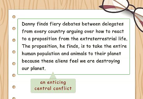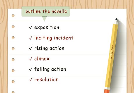 Outline the novella. You can outline for the novel by using a plot diagram, which consists of five sections: exposition, inciting incident, rising action, climax, falling action, and resolution. You can also use a three act structure, where there is a set up, a conflict, and a resolution. Another way you can outline the novella is by using the snowflake method. This method consists of four sections: a one sentence summary, a one paragraph summary, a synopsis of characters, and a spreadsheet of scenes.