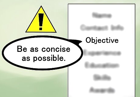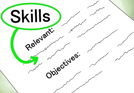 Add an Objective section at the top. Be strategic: rethink your skills through the job or type of jobs you are applying for and turn them into a positive asset. Phrase your skills as action words ("developed", "managed", "collected") and always link them to specific experiences. However, keep the focus on the job and how your skills can best help you achieve your future goals. Keep in mind this section should be only a few lines long. Be as concise as possible. Omit those skills that are irrelevant to the purpose of the job.