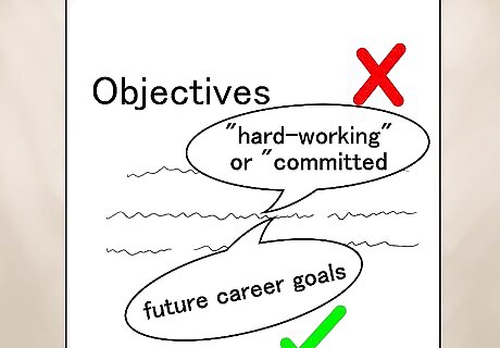 Write your Objective. This is where you should address the specific position and how your knowledge and skills make you suitable for the role. The section shouldn't take more than three or four lines. If you are just writing a general resume, leave it blank and write it later based on each job's requirements. Avoid generic statements and adjectives such as "hard-working" or "committed". Instead, you should draw attention to what makes you unique. Keep the focus on your future career goals rather than your personal qualities, and list clearly and concisely what you want to achieve and why this particular job can help you achieve it.