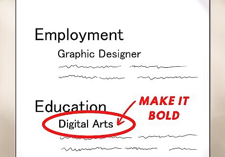 Choose a formatting style. Stick with professional-looking fonts like Arial, Georgia, Calibri, Garamond, etc. You can use bold type, block letters or a different color to highlight important information. However, avoid using too many colors as this will make your resume harder to read. For example, in your "Employment" section the job title can be in block letters while the duties can be formatted as regular text. In your "Education" section, the name of your degree can be in bold while the name of the university can be formatted as regular text.