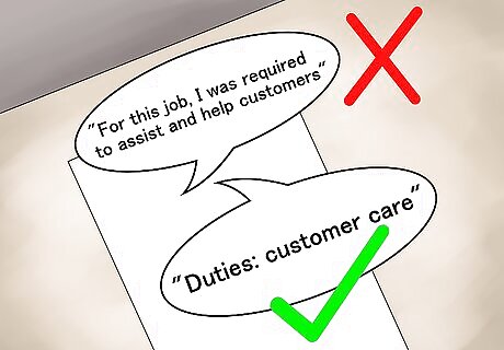 Make your writing simple and concise. Avoid using full sentences and try to be as schematic as possible. For example, you can summarize the sentence "For this job, I was required to assist and help customers" by simply writing "Duties: customer care". Avoid repeating yourself and rephrasing competences or skills you have already listed.