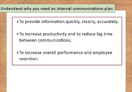 Get leadership on board. If the highest leaders in your organization are not willing to support an internal communications plan, your job becomes convincing them of its importance. Without their support, little will change in your internal communications. People will remain uninformed and unsure of what is going on. Outline the ways that an internal communication plan can lead to increased trust and productivity. (Employees work harder when they feel like a part of what's going on.) Talk about how an internal communications plan can increase efficiency. (The plan ensures that all information flows effectively, and that all employees are adequately informed of changes in a timely way.)