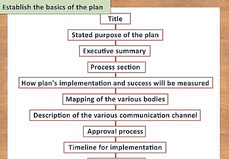 Establish the basics of the plan. Start by considering what format you want to use. You might use a document, presentation, or spreadsheet, depending on who will be using the document and how. Then, consider the length of your plan. It needs to be long enough to cover all of the information, but still short enough to be useful and accessible. For example, a simple plan might be 2-4 pages, while a more complex one could be up to 15. Start writing your plan by making a basic structure with the following parts: The title. The stated purpose of the plan (increase clarity, productivity, sales, etc.). Executive summary that outlines the rest of the plan. A process section explaining the current situation and changes to be made. A section detailing how the plan's implementation and success will be measured. A segmentation or mapping of the various bodies that need to be communicated with. A description of the various communication channels and when/how they will be used. The approval process and list of plan creators. A timeline for implementation. An appendix for additional documents.