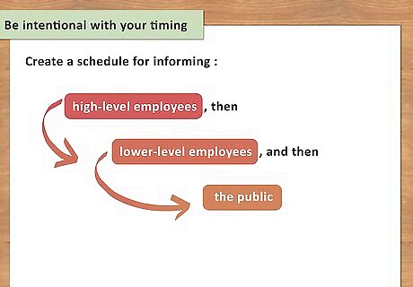 Be intentional with your timing. Your message should be delivered in a timely manner. This will differ depending on the situation. However, a good principle of organizational communication is that your staff should know before the public knows. You may want to consider staging messages so that higher-level staff are informed first, then lower-level staff. Let's say your business is merging with another company. Of course, the highest level employees will know about the change first. However, you don't want the rest of your employees to simply show up one morning to see a different name on the door. Create a schedule for informing high-level employees, then lower-level employees, and then the public.