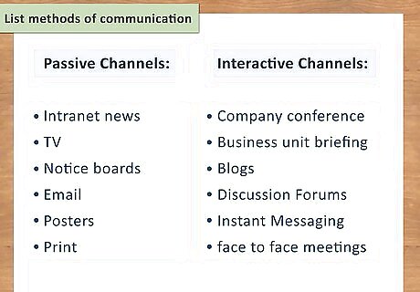 List methods of communication. There are various ways to share your information. Identify all potential methods of communication and what type of messages should come through each one. Consider which method is best, not only for your employees and their preferences, but also for the message and situation at hand. For example, sensitive situations tend to require face-to-face communication, not emails or a newsletter. Formal methods are intentional acts of communication and include scheduled meetings, company newsletters, all staff emails or meetings, and reports. Informal networks are more organic conversations that take place in offices, break rooms, and during lunch. They can also occur via email, social media accounts, and phone conversations.