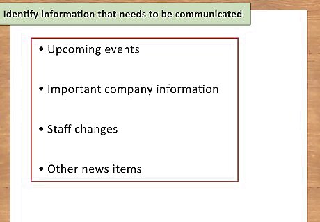 Identify information that needs to be communicated. For now, focus on a single message that you would like to communicate, perhaps your vision or mission statement. As you develop your internal communications plan, include announcements about upcoming events, important company information, staff changes, and other news items.