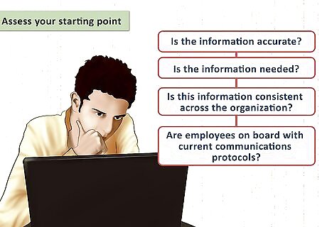Assess your starting point. Before creating a new communications plan, you'll need to diagnose the problems with your current communications. Make sure to examine the whole organization, from top to bottom and in all departments. Look for blockages, information delays, uneven information, and issues with accuracy or clarity. Ask the following questions for each communication line: Is the information accurate? Is the information needed? How are regular updates sent? Is this information consistent across the organization? Are employees on board with current communications protocols?