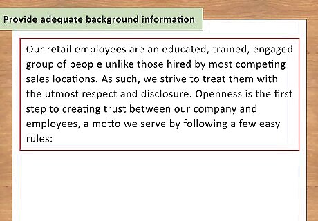 Provide adequate background information. Make sure enough background information is provided to give context to lower-level employees. They do not have access to the information higher-level leaders have. Give them what they need to know to fully comprehend the news being shared. If you are drafting an email that talks about a change in company policy, explain some of what led up to this change. Let's say your company is changing the way employees request vacation days. In your email, explain that this change is being implemented to a provide more accessible public calendar, so that all employees can anticipate planned employee absences and work to prepare for them. Your employees will see the benefit of this change and not view it as a nuisance.