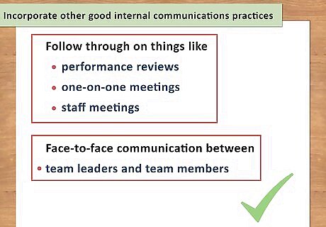 Incorporate other good internal communications practices. To keep internal communications running smoothly, there are some structures to put into place. Decide which ones will work best for your organization. Follow through on things like performance reviews, one-on-one meetings, and staff meetings. Employees need to know they can trust you to keep your word and to keep information flowing. Encourage face-to-face communication between team leaders and team members. Communication cannot be entirely via electronic devices if you want relationships to develop.