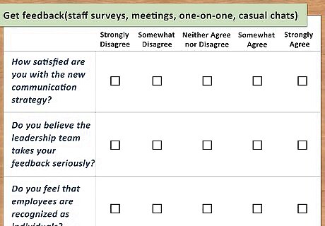 Get feedback. After communicating important information, you need to see how it was received. You can do this through staff surveys, meetings, one-on-one, casual chats, and lunches. Encourage staff to ask questions whenever they do not understand or agree with specific messages. Create an atmosphere of engagement by making it clear that you don't simply talk at your employees, but you also listen and respond. This ensure that employees are engaged, not simply taking orders.