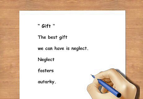 Avoid adjusting the poem too much. Once you have completed the chance operation on the original text and have generated a poem, you should read it over. Read it out loud and consider how the words sound together on each line. Note any interesting images or phrases that appear in the poem. Though it may be tempting to edit the poem so it fits a certain idea or theme, you may want to consider not adjusting it too much. A big part of chance poetry is allowing the words to exist on the page as they appear, by chance. Adjusting them too much would conflict with the chance aspect of the poem and potentially ruin your chance operation.