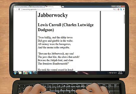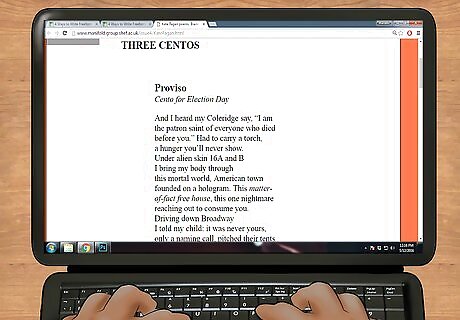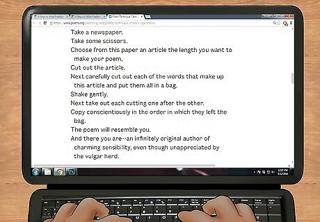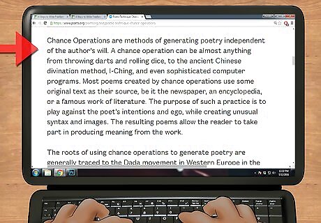 Look at examples of chance poetry. To get a better sense of the possibilities inherent in chance poetry, you should read several known examples of chance poetry. Several examples include: “Stein 100: A Feather Likeness of the Justice Chair” by Jackson McLow. “Three Centos” by Kate Fagan. “Head Citations” by Kenneth Goldsmith.