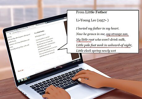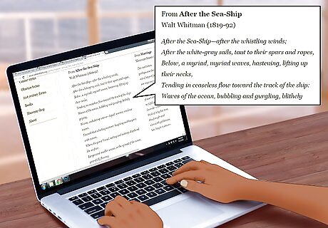 Read examples of free verse poetry. Free verse poetry does not have a structure and there are no rules around meter or rhyme scheme. As the poet, you have the freedom to express yourself any way you would like, while bearing in mind that free verse poetry is still a form of artistic expression. You can use the freedom of free verse to create striking images and explore a range of emotions. To get yourself in the mindset of a free verse poet, you should read several examples, including: “After the Sea-Ship” by Walt Whitman “Little Father” by Li-Young Lee “Winter Poem” by Nikki Giovanni “in Just” by e.e. cummings