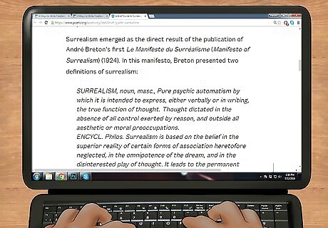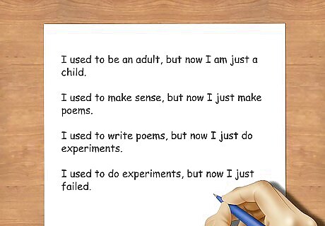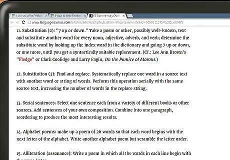 Make the surrealist poem. Once you have selected your experiment, you will need to perform it to make the surrealist poem. This may mean using an original text and manipulating it in some way or creating original content based on the rules of an experiment. Depending on the experiment you select, you may end up “making” the poem by compiling existing text in a certain way or you may end up actually writing the poem using certain rules and guidelines. Try to stick to the rules and guidelines of your chosen experiment, as this could lead to some interesting results. You may be surprised by what happens to the original text when you apply the experiment to it. You may also be surprised by your own writing when you follow the rules of an experiment and avoid directing the results. For example, maybe you decided to do the alliteration experiment, where each line or word starts with the same letter. You may write down a list of words that start with a certain letter, such as the letter "a" and then organize them according to your preference. A line in your poem may look like: "An aardvark at an abandoned atrium ate all apples". Alternatively, you could choose a more challenging experiment like "n+7" and choose a word in the dictionary to act as your anchor word. You could then count seven up from the word to determine the next word in a line of the poem.