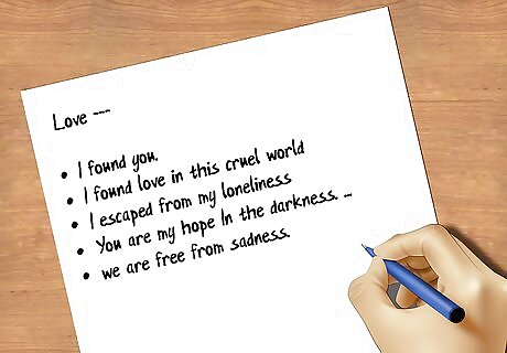 List keywords and images that describe your subject or topic. In free verse poetry, you have the freedom to play with meter, structure, and language. To generate content for your poem, you can write down a list of keywords and images that relate to your subject or theme. You can then string these words and images together to form lines for the poem. For example, if you want your poem to focus on the theme of sadness, you may write down words and images that communicate “sadness” to you. You may focus on specific moments in your life when you felt sadness and use these images to create the poem. If you are not sure how to describe a certain event or feeling, use the five senses (sight, touch, taste, smell, and sound). Rather than write, “I felt sad when my mother died” you may note where you were when you found out she passed away or your last conversation with her before she died. You may also include sensory details about the feeling of your mother’s hugs or the smells of her baking or cooking.