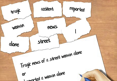 Create the first draft of a chance poem. No matter what type of chance operation you choose, often the fun part is doing the chance operation on the original text. The only real rule in chance poetry is to commit to the chance operation, even if it creates a text that may not make sense or be clear on the first read. Following the chance operation can also allow you to create unique images and lines that you may not have thought of on your own. You may want to limit how long the poem is going to be so you can determine when the chance operation can come to an end and you can finish the poem. For example, you may have chosen to cut out words from an original text and putting them together to form lines of a poem. If you choose a newspaper article, you may have terms like "tragic" "accident" "news" "I" "reported" "street" "woman" "alone". You may then arrange these words so they form a new image, such as: "Tragic news of a street woman alone" or "I reported a woman alone".