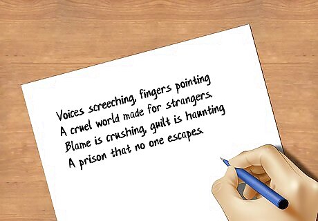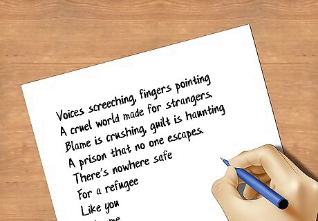 Create the first draft. Once you have a list of words and images, you should start to string them together to form the first draft. Describe one particular scene or a series of moments that connect to the theme of your poem. You should use devices like metaphor, simile, alliteration, and personification. Your first draft does not need to be perfect, as you will edit and revise it. You may start by stringing together keywords and then looking at how they play off each other. You may have keywords around sadness such as "mother" "death" "childhood" "lost" "poor" and then string them together, "I see my mother on her deathbed, I see my childhood, lost and poor." You may then integrate metaphor, simile, or personification into the poem. For example, "My mother sits like a broken bowl on her deathbed", or "My only toy is a doll I shared with sister, as torn up as we were poor."