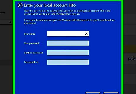 Enter your local account info. At this point, you can either enter the information associated with a current local account or create a new one. Type in your username and password (you’ll need to type the password twice to confirm it). You can also enter a password hint if you like. Click Next to continue.