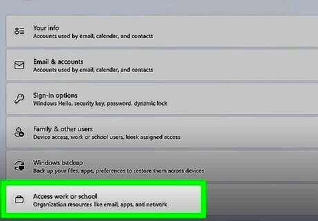 Select Access work or school. It’s under the Account settings header. You might need to scroll down to find it.