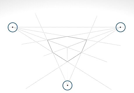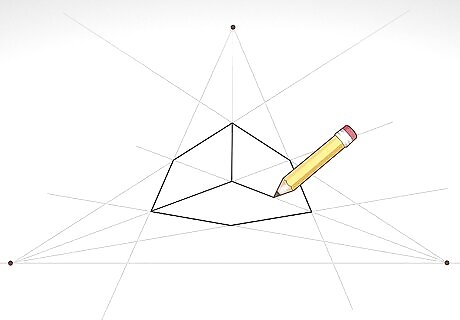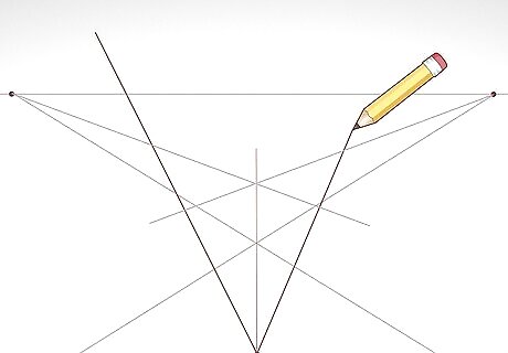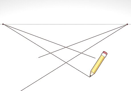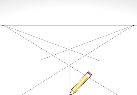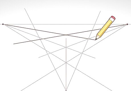 Draw lines coming up from the third vanishing point. Using your straight edge, draw one line starting at the third vanishing point and going upward far enough to intersect with the left-most point where the lines you previously drew also intersect. Then, draw a second line from the third vanishing point, this one intersecting with the right-most point where your previous lines intersect. Keep drawing each line past the main intersection point, so they’re crossing both sets of lines you already drew.