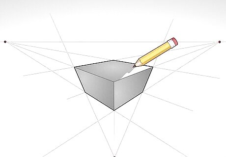Darken the lines of your box and add shading, if you want. Your box is drawn—now you just have to finalize it! Darken the parts of your lines that actually make up the outline of the box, and erase the rest. Then, shade in each visible side of the box (there are three: the top, right, and left) to further add to the illusion of space. Try shading different values on each side, so it looks like there’s a light source! That means having a light side, a dark side, and a medium-value side. You don’t have to erase your horizon line or vanishing points, yet. If nothing else, leaving most of your lines and points can be a good visual aid to remind you how three-point perspective works, the next time you try it!